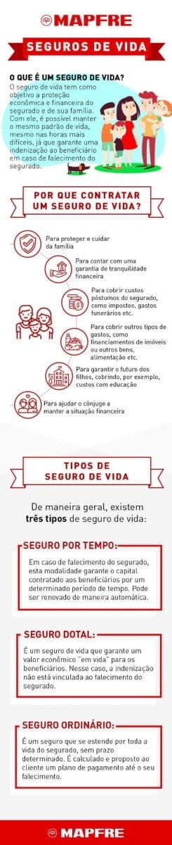Muitas pessoas se sentem mais tranquilas fazendo um seguro de vida, já que isso garante sua proteção e de sua família. A contratação de seguro de vida permite proteger e cuidar de sua família em caso de falecimento e com despesas que possa ocorrer (funerárias, alimentação, educação, imóveis, etc.), veja o exemplo nesta imagem: