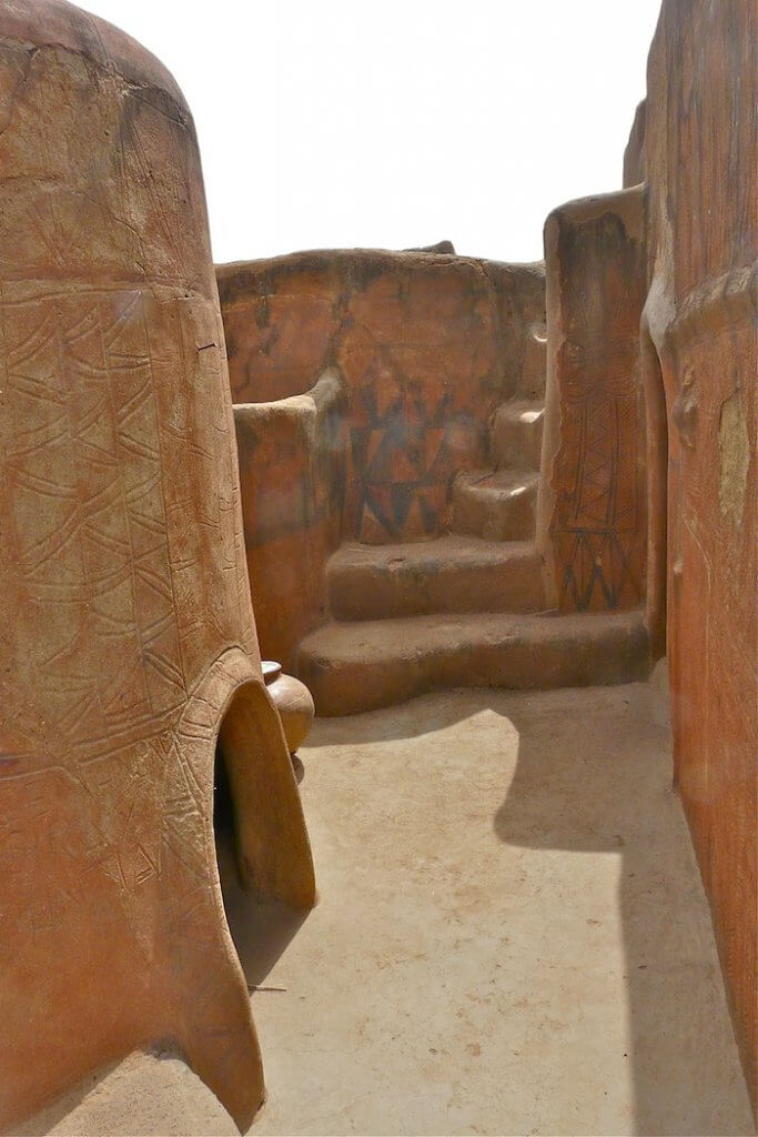 A característica mais surpreendente, no entanto, é a intrincada ornamentação que cobre quase toda polegada quadrada das habitações, pintada com lama colorida e giz que contam uma história expressiva da cultura da antiga tribo. Os motivos podem ilustrar praticamente qualquer coisa, desde objetos usados na vida cotidiana normal da religião e crenças, até padrões decorativos que distinguem uma casa da outra. A obra de arte é então gravada com pedras e gravuras que destacam os desenhos e dão um caráter verdadeiramente único. O material, junto com pequenas aberturas geralmente localizadas mais perto do solo, auxiliam em temperaturas interiores confortáveis.