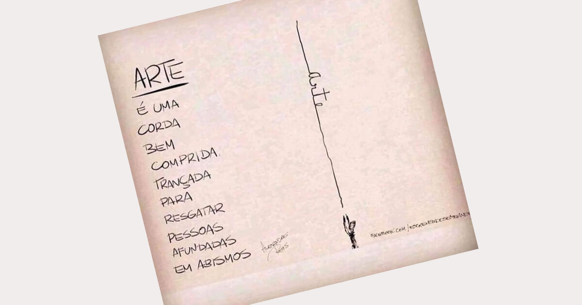 “A arte é uma corda bem comprida trançada para resgatar pessoas afundadas em abismos”. Essa linda frase de autoria do Alexandre Reis me trouxe grandes reflexões que venho compartilhar aqui com você.