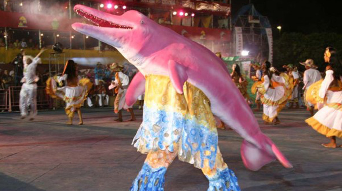 Nas noites de junho, em meio às festas juninas, quando um boto rosa entende ser o certo momento, ele se transforma num homem forte, alto, de espantosa beleza. Suas palavras são poéticas e a sua voz, embora grave, tem a doçura dos rios em que vive. Seus olhos trazem a sede às mulheres. É assim que ele as convence.