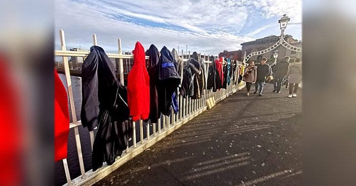 Tudo aconteceu na véspera de Natal, na ponte Ha’ppeny, que atravessa o rio Liffey, na cidade de Dublin. Naquela manhã, a estrutura amanheceu com muitos casacos pendurados.