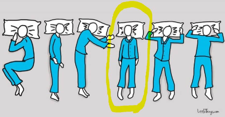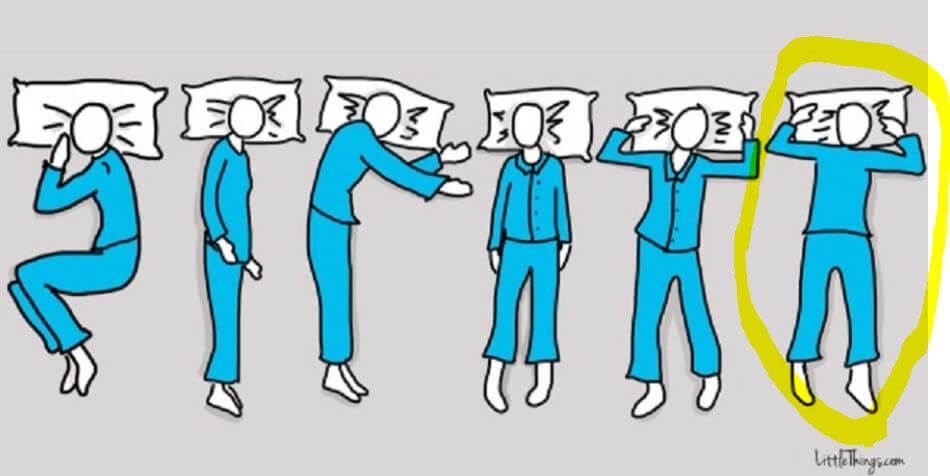 Um seleto grupo de 5% é aquele que, ao deitar, se deita sobre as costas e dobra os braços para cima. Também pode dobrar um pouco as pernas.