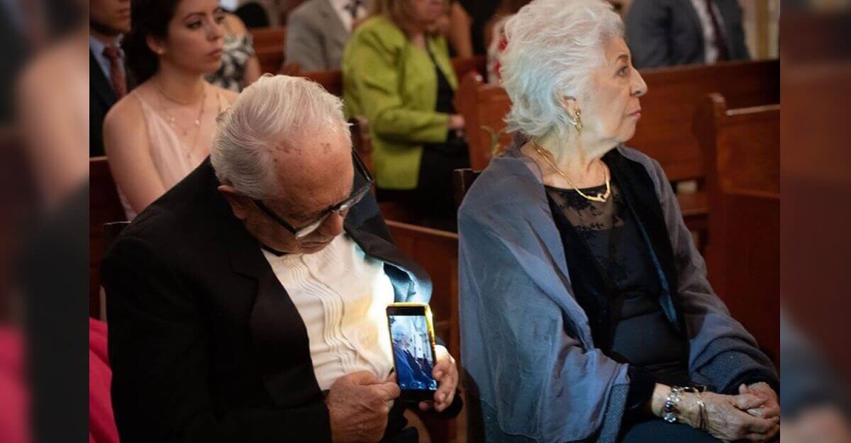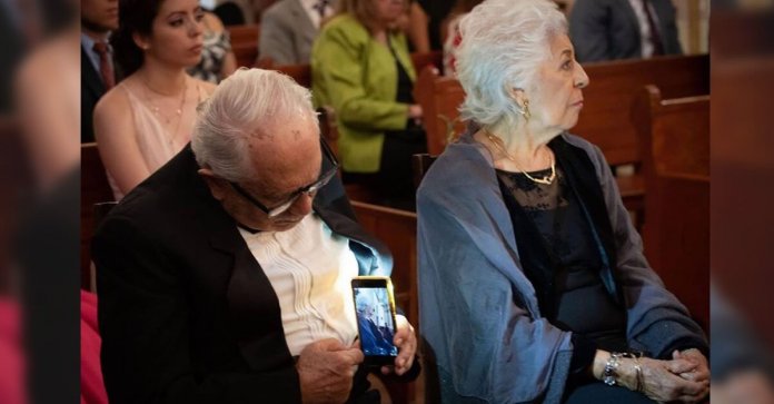 Enquanto fotografava um casamento em Lagos de Moreno, ele os viu: um casal de avós sentado nos bancos da igreja. Ele olhou mais de perto e notou, o velho segurou seu celular cuidadosamente em suas mãos para tirar uma foto de sua amada, em segredo, sem que ela percebesse. Como guardar um tesouro que ninguém mais pode ou deveria ver.