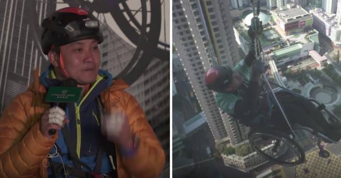 A escalada durou 10 longas horas em um evento que planejava arrecadar o equivalente a US $ 600.000 para pacientes com problemas na medula espinhal. O homem de Hong Kong ficou a 50 metros do topo.