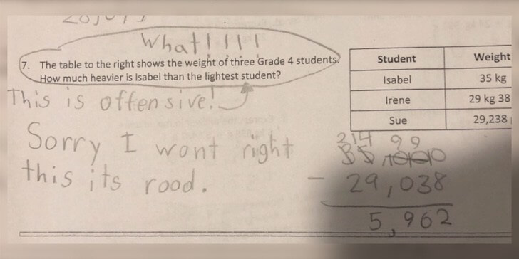 E quando a mãe se aproximou da filha, percebeu que uma das perguntas do seu dever de casa, dizia : “A tabela à direita mostra o peso de três alunos da quarta série. Quanto quilos mais pesada é Isabel do que a aluna mais magra?”. O exercício preocupou a menina de 10 anos, afinal as crianças que possuíam inseguranças com seus corpos poderiam se ofender, e se sentirem ainda mais inseguras.