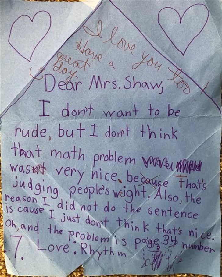 “Rythmn circulou a pergunta na lista de exercícios de matemática e escreveu: ‘O QUE!’ (…) Ela desenhou uma flecha apontando para a pergunta e escreveu: ‘Desculpe, não vou responder, isso é rude’” – relatou a mãe da menina.