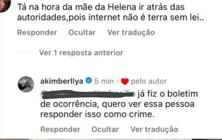 A decisão de Amanda foi motivada por uma sugestão de uma seguidora no Instagram, que ressaltou a necessidade de buscar ajuda das autoridades diante dos ataques diários. “Tá na hora da mãe da Helena ir atrás das autoridades, pois internet não é terra sem lei”, escreveu a usuária.
