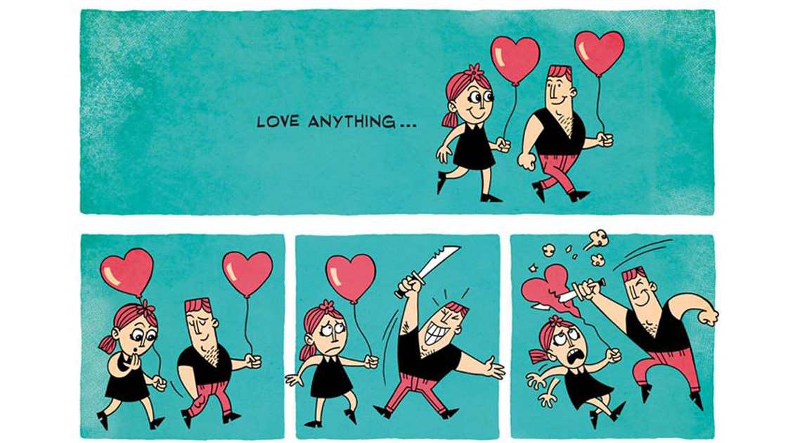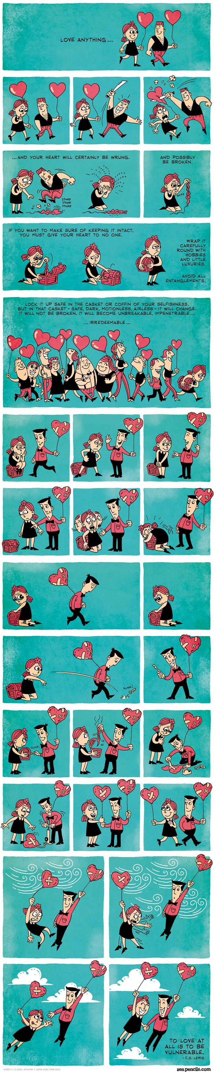 Essa tirinha mostra de maneira bem humorada o quanto um relacionamento pode nos ferir quando algo não dá certo. Após a decepção, a tendência das pessoas é se fechar para novas experiências (guardar suas dores, sentimentos e coração ferido num baú e, se possível, ainda jogar a chave fora). Entretanto, depois de um tempo, a esperança e a ilusão podem voltar e, quando a pessoa menos espera, lá está ela novamente, voando vulnerável…