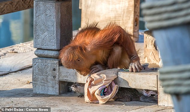 Uma imagem mostra o orangotango mais jovem, Berani, parecendo brincar de esconde-esconde com uma lontra, que descansa sob uma plataforma de madeira.