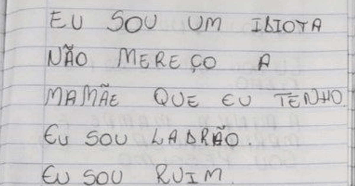 Frases como “Eu sou um idiota”, “Eu não mereço a mamãe que eu tenho” e “Eu sou um filho horrível” foram escritas pelo garoto.