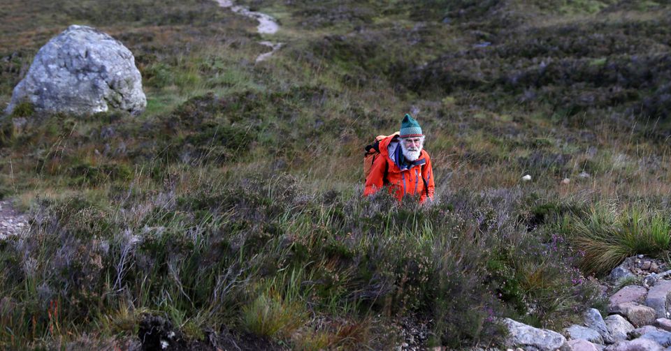No cume de Buachaille Etive Mòr, um pico escocês a mais de 1.020 metros acima do nível do mar, Nick Gardner, de 81 anos, para para contemplar os picos escarpados, lagos e vales visíveis através das nuvens à deriva.