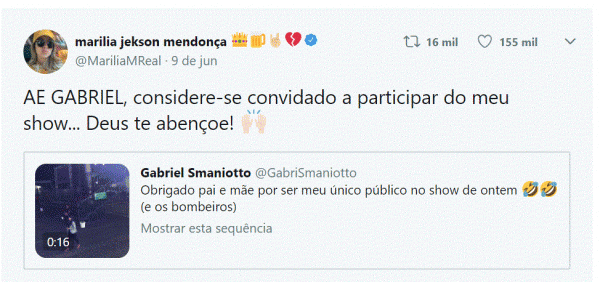 O post viralizou na rede social, com quase 214 mil curtidas e 27 mil compartilhamentos. E o cantor começou a receber centenas de respostas, inclusive de alguns artistas renomados no cenário da música nacional, como Mc Pocahontas, Mc Bin Laden, Tati Quebra Barraco e o pessoal do Raça Negra. Até a apresentadora Maisa mandou um recadinho fofo de incentivo para Gabriel. Além do apoio, o cantor ainda recebeu um convite especial de ninguém mais ninguém menos do que a estrela da música sertaneja do momento, Marília Mendonça. A rainha da sofrência twittou pára Gabriel: “AE GABRIEL, considere-se convidado a participar do meu show… Deus te abençoe!”