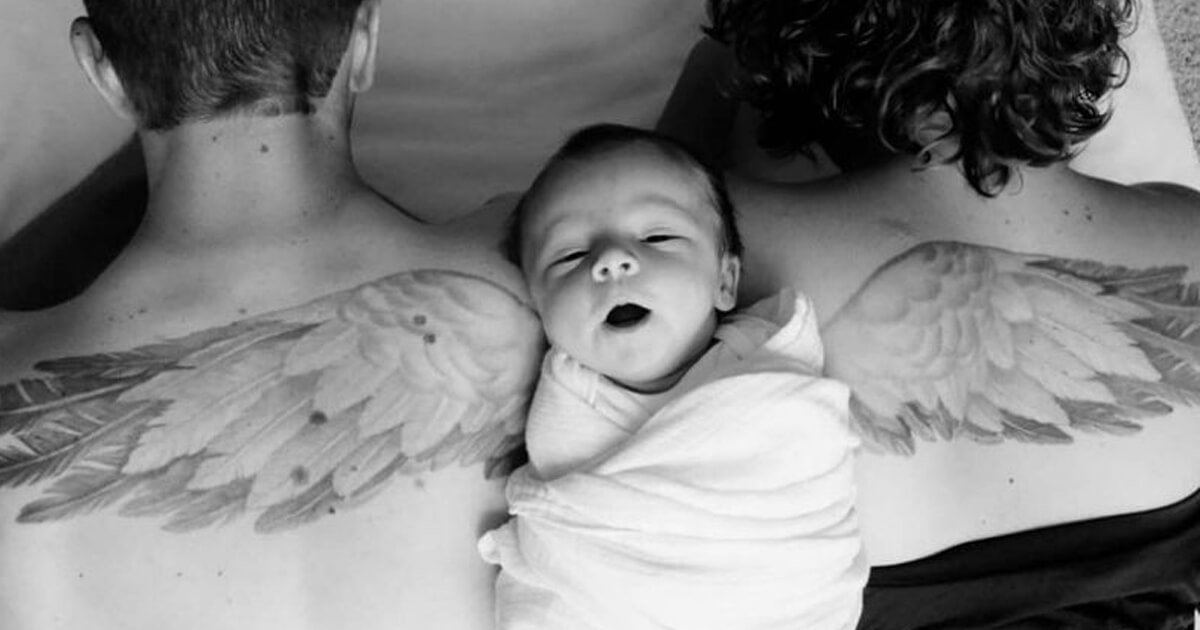 Para apresentá-la ao mundo, eles fizeram uma foto onde a menina aparece posicionada no meio das tatuagens e completa o anjo.