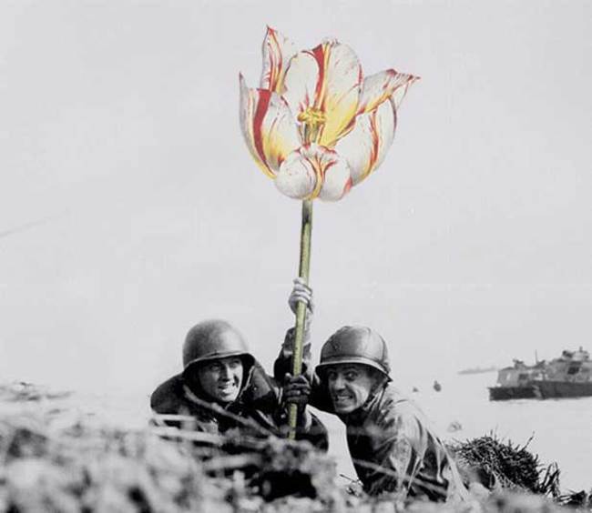 Artista francês Mister Blick cria colagens pungentes usando fotos antigas de soldados armados, só que , em vez de armas, os militares são vistos segurando flores.