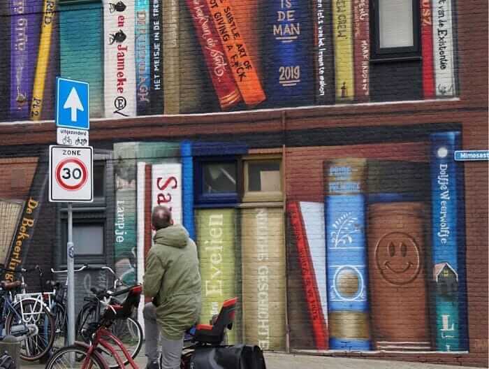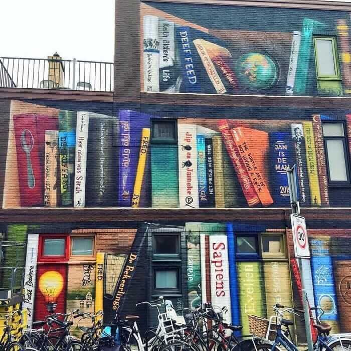 Enquanto muitos artistas de rua escolhem prédios abandonados e antigos trilhos de trem como telas para suas obras-primas explosivas, o artista de rua holandês Jan Is De Man opta por outro caminho: fazer trabalhos animados para as comunidades locais que desejam se conectar. Seu objetivo é criar projetos “de onde todos se identificam”, solicitando a participação dos moradores que o encomendam. O presente mais recente de De Man para um bairro é uma inacreditável estante de três níveis em um prédio de apartamentos em Utrecht, na Holanda. O artista foi ajudado pelo artista de rua Deef Feed.