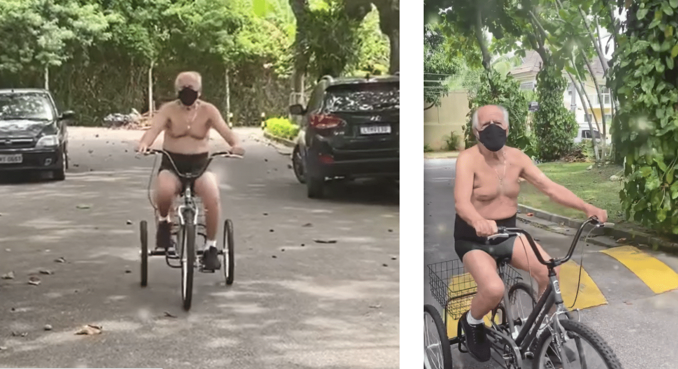 Nele, esbanjando saúde e vitalidade, o ator octagenário aparece pedalando um triciclo. Munido de máscara e cheio de simpatia ele declara: