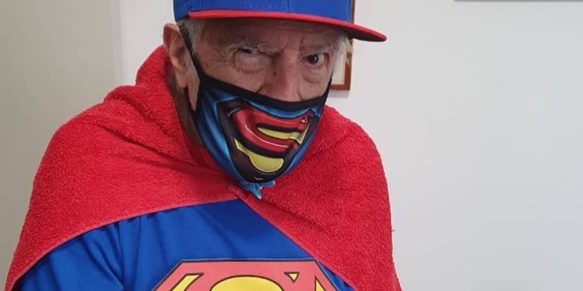 Com uma toalha vermelha nas costas e uma camiseta e um boné com a marca do super-herói, o ator de 87 anos tenta fazer cara mal, mas continua sendo o blogueiro mais fofo da internet.