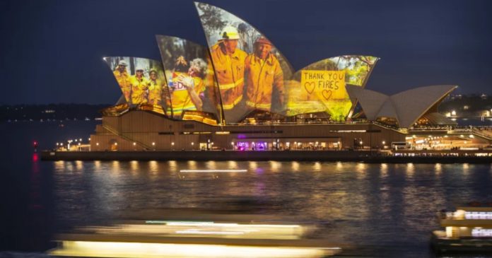 As icônicas velas da Ópera de Sydney foram acesas na noite de domingo, 12, com imagens daqueles que lutaram contra os incêndios na Austrália, como demonstração de agradecimento e solidariedade.