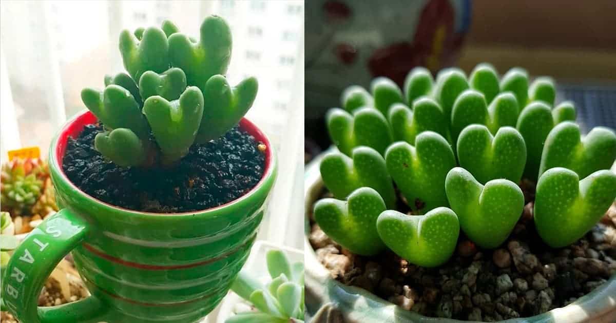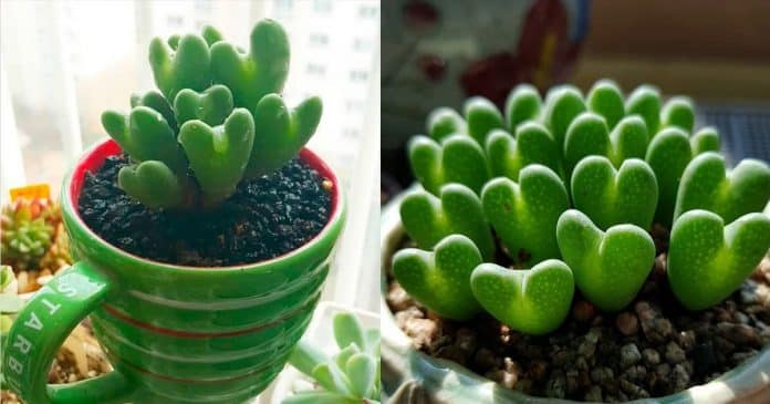 Como o próprio nome diz, esta linda suculenta cresce em grupos e com a forma de um coração. Seu tamanho é pequeno e cuidando bem, elas podem crescer fortes e até algumas pequenas flores amarelas e rosas serão abertas durante o outono e o inverno. Esta espécie é nativa da África do Sul e é um desafio importante obtê-la: é considerada uma planta diferente que cresce apenas em alguns setores de maneira selvagem. A planta deve ficar em um ambiente com iluminação difusa ou meia e o solo deve ser enriquecido com matéria orgânica, drenável e irrigado regularmente, mas sem exageros, essa plantinha é originária de lugares secos.