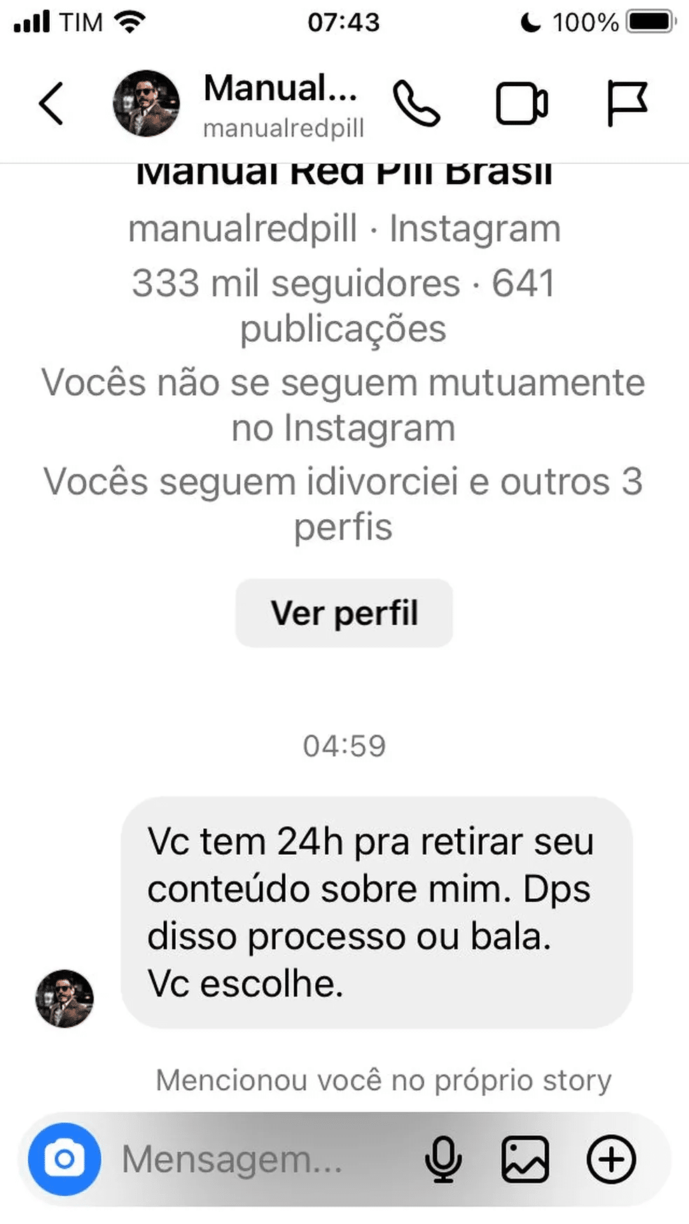 “Você tem 24 horas para retirar seu conteúdo sobre mim. Depois disso é processo ou bala. você escolhe”, diz uma das postagens enviadas para a artista.
