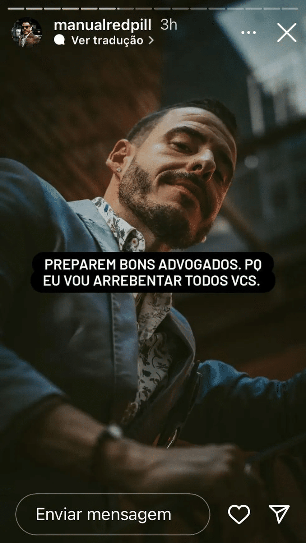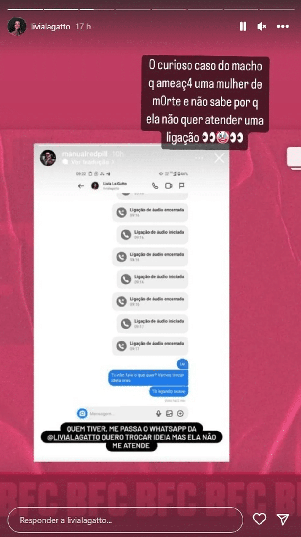 Após fazer a postagem, Livia passou a ser ameaçada pelo influenciador. Ela relata ter recebido mais de 10 ligações por meio do Instagram.