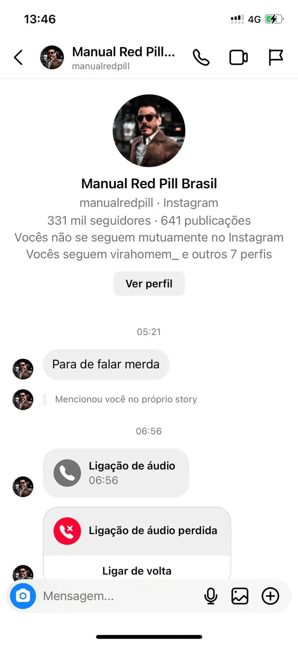 Ela diz que, logo em seguida, ele ligou para ela pelo Instagram e ela não atendeu.
