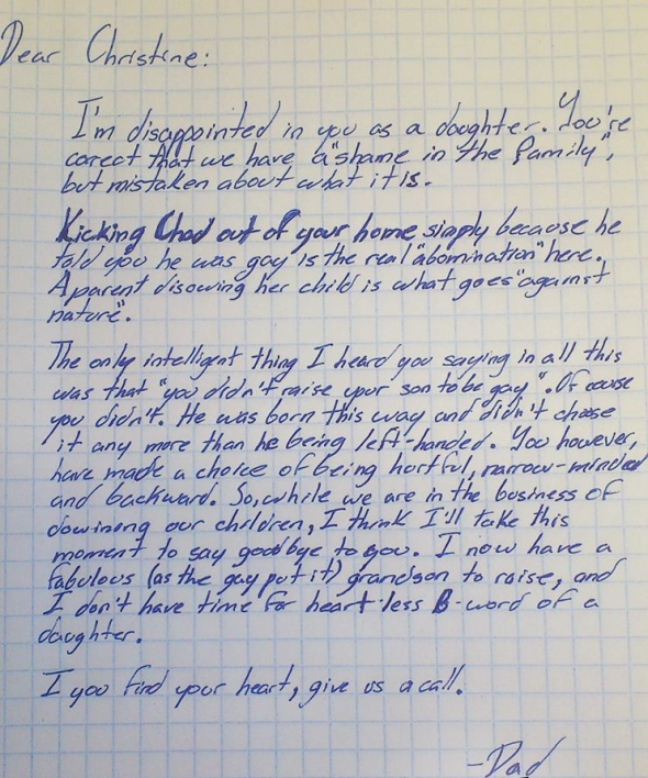 A única coisa inteligente que ouvi você dizer sobre tudo isso é que “não criou seu filho para ser gay”. Claro que não criou. Ele nasceu assim e escolheu isso tanto quanto escolheu ser canhoto. Você, entretanto, fez a escolha de ser ofensiva, mente-fechada e retrógrada. Então, já que esse é um momento de abandonarmos filhos, acho que chegou a hora de dizer adeus a você. Sei que tenho um fabuloso (como os gays dizem) neto para criar e não tenho tempo para uma filha que é uma vadia sem coração.
