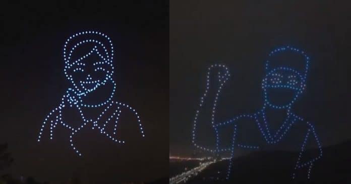 O show foi conduzido por 300 drones iluminados em voo sincronizado. O “balé” aéreo trouxe imagens simbólicas e frases de agradecimento, sempre fazendo referência aos médicos e enfermeiras que fizeram total diferença para os cuidados da população local.