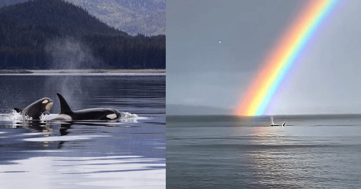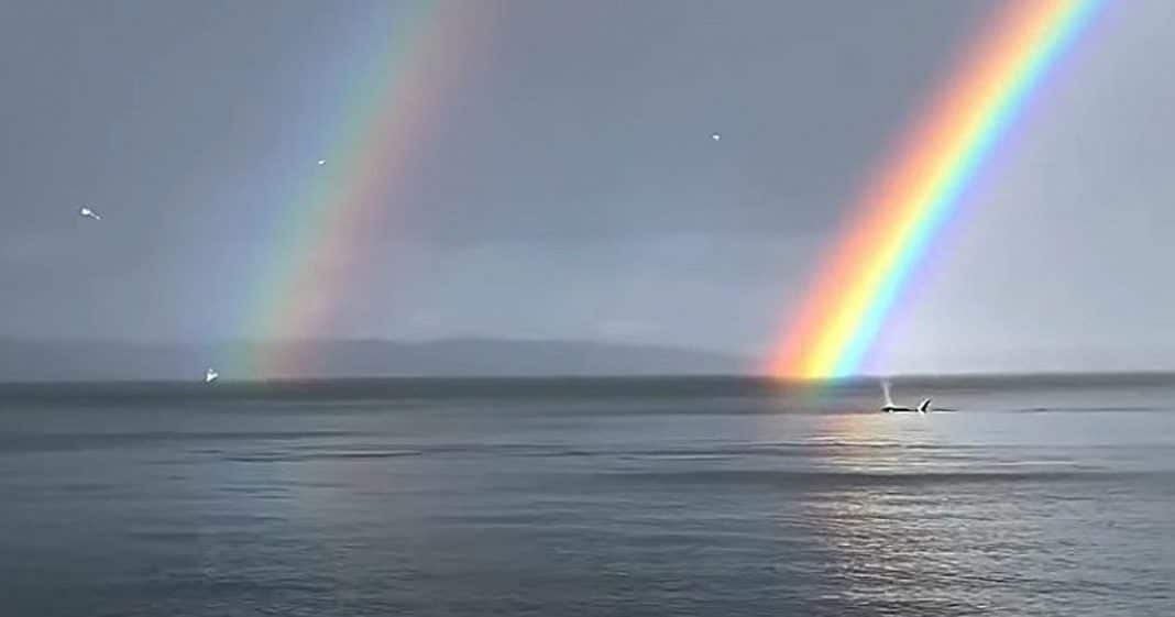 A cena mágica ocorreu em Puget Sound, uma profunda enseada estuarina do oceano Pacífico localizada na costa noroeste dos Estados Unidos, perto de Seattle, Washington. A imagem dessas orcas nadando sob um arco-íris oferece uma vista deslumbrante de uma cena pacífica.