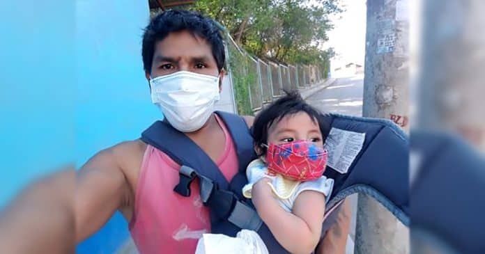 O jovem pai costuma trabalhar como operário de construção, mas agora está desempregado e também não pode deixar o filho sozinho.