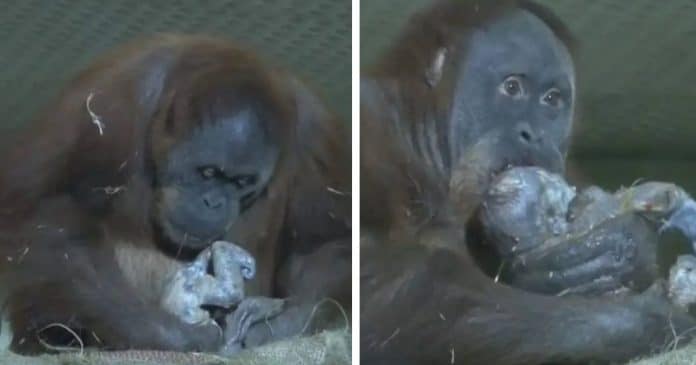 A partir do momento em que o filhote chegou ao mundo, Dana imediatamente cumpriu seu papel de mãe. Ele pega o pequeno orangotango em suas mãos e gentilmente o embala e usa a boca para limpá-lo. Um dos observadores comenta: