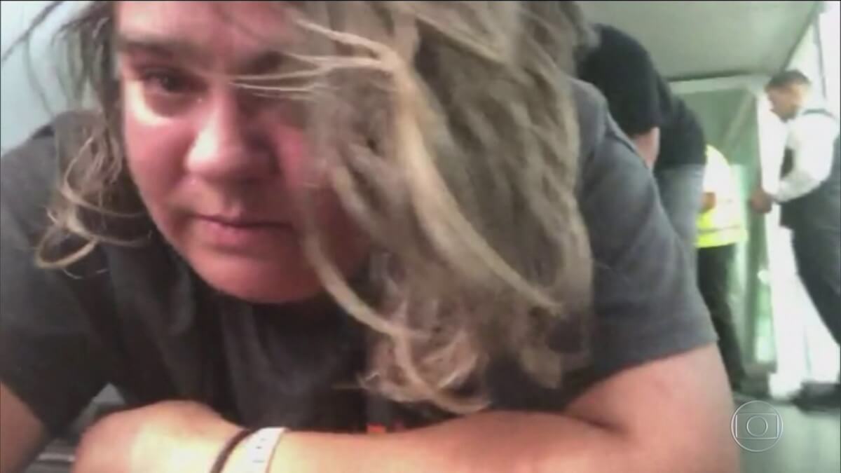Aline foi a última passageira a sair do avião no colo de dois funcionários do aeroporto. Ela disse que foi maltratada depois que insistiu em levar um travesseiro da companhia aérea.