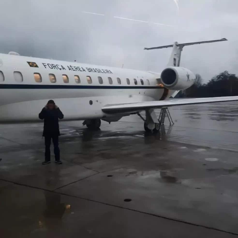 Na tarde desta quinta-feira, ela postou um vídeo em sua rede social no qual mostra o pouso do avião KC-390 Millennium. Ela já havia pousado e estava com seu cachorro Thor no solo.