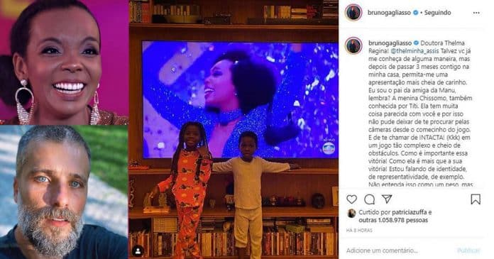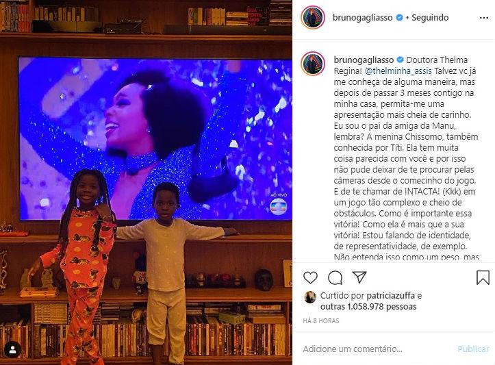 No último dia 28, após a vitória de Thelma, no Big Brother Brasil, o ator Bruno Gagliasso, conhecido tanto por seu trabalho como ator e modelo, como marido de Giovanna Ewbank como também como pai de Titi e Bless, enviou uma mensagem emocionante para a campeã dizendo da importância de sua vitória: