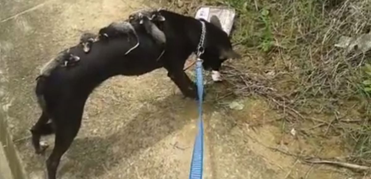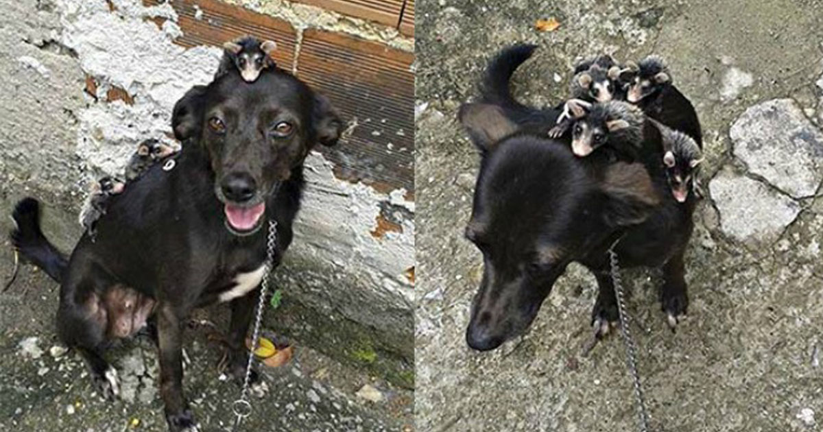 Pretinha é esterilizada para não produzir leite, mas isso não a impediu de dar-lhes o abrigo que aquelas pequenas e indefesas criaturinhas precisavam naquele momento . Os gambás a escalam como fariam com a mãe, e ao que tudo indica, Pretinha adora!
