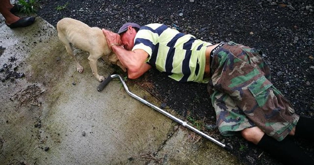 A cachorrinha então os guiou até um homem caído no chão com uma bengala ao lado. O homem esatava gravemente ferido.