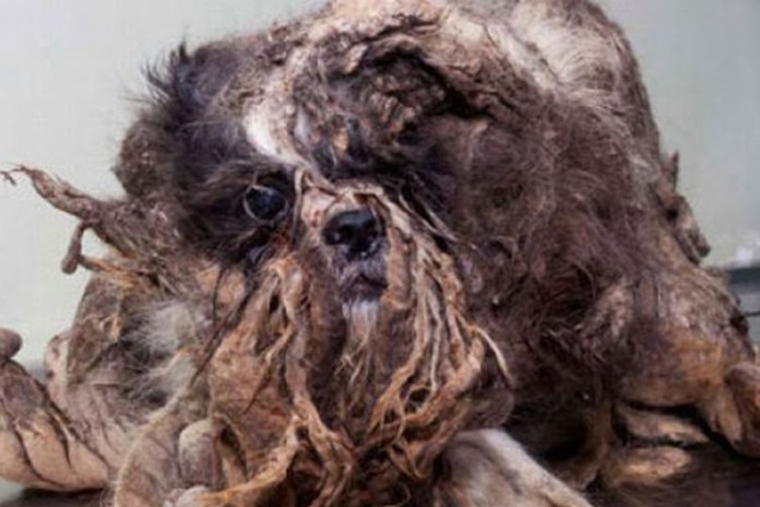 Abaixo, você verá imagens de um cãozinho encontrado em total estado de abandono.