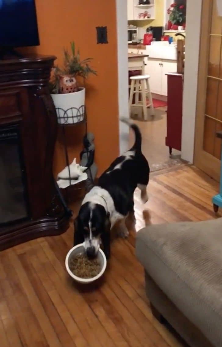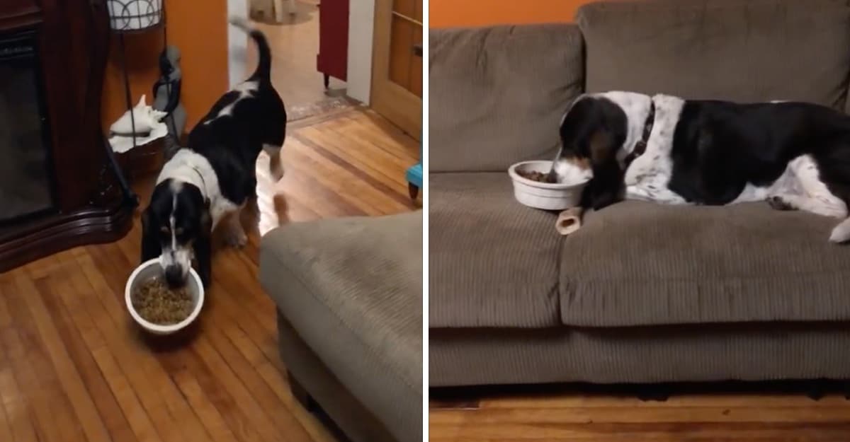 Como pôde ser visto no vídeo compartilhado no TikTok, pela usuária Audrey Waito-Prince , este fofo Basset Hound caminha com seu prato de comida na boca até chegar no sofá de sua casa, que fica ao lado da mesa de jantar, onde sua querida dona está sentada.