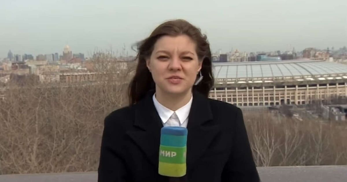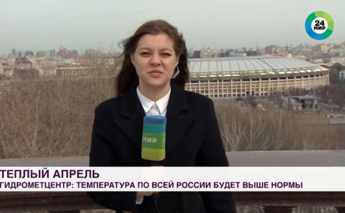 Serezhkina, correspondente do telejprnal MIR24, tinha apenas começado a falar para a câmera quando, de maneira brusca e inesperada, foi interrompida por um fato inusitado.