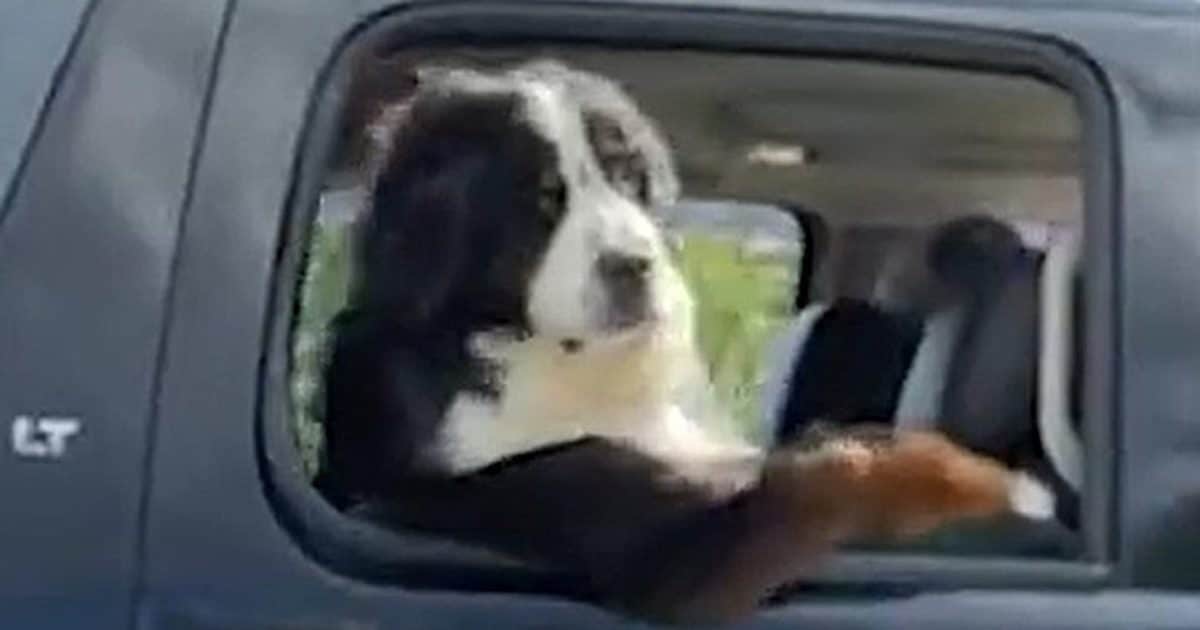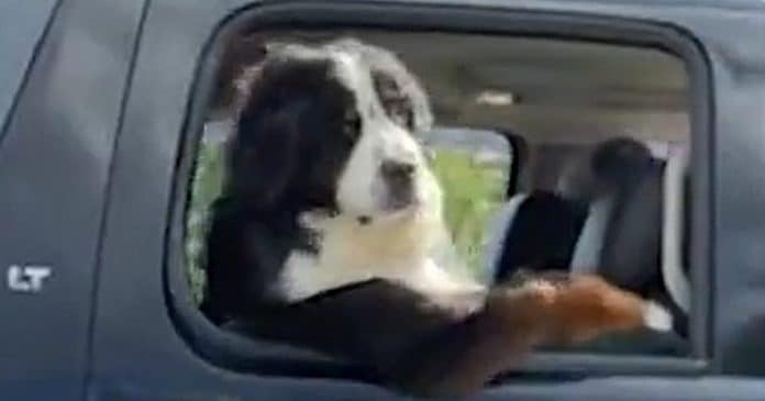 O casal avistou a cena inédita do cachorro da raça bernese sentado no banco de trás de um automóvel, com uma pata apoiada na janela e aproveitando o ventinho.