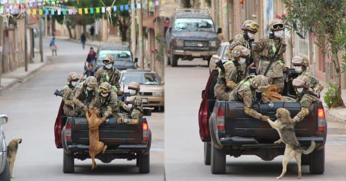 Nos últimos dias viralizaram no Facebook algumas fotos que mostram um carro com militares bolivianos acolhendo 2 cães de rua que praticamente “se jogaram” para ficar com os soldados.