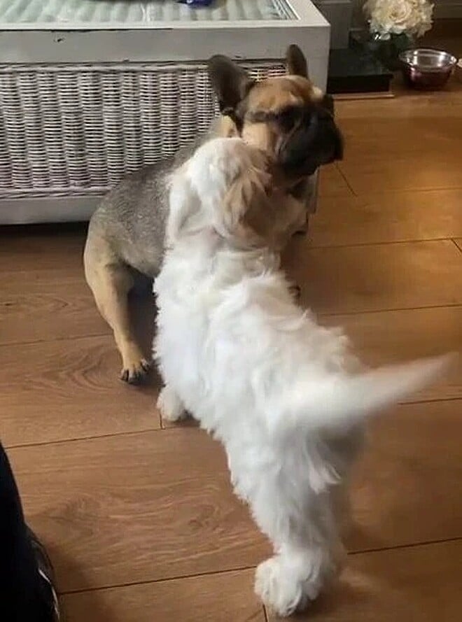 Harley e Kottie estavam em cima da lona de proteção da banheira de hidromassagem, que fica na área externa da casa. Enquanto a buldogue repousava tranquilamente sob o Sol, a cockapoo, por ser filhote, brincava agitada.