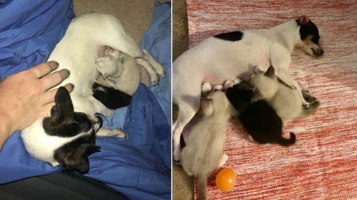 Enquanto Jones observa a cachorra amamentando os gatinhos, ela ficou maravilhada e não conseguiu conter as lágrimas. “Eu pessoalmente nunca vi algo assim. Tudo aconteceu tão rapidamente, como deveria ser.”