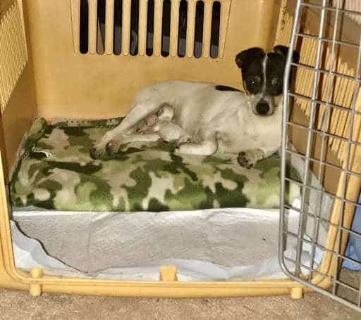 A nova família mudou-se para uma grande caixa juntos, e a cachorrinha, agora batizada como Keeper, cuidou dos filhotes por cinco semanas.
