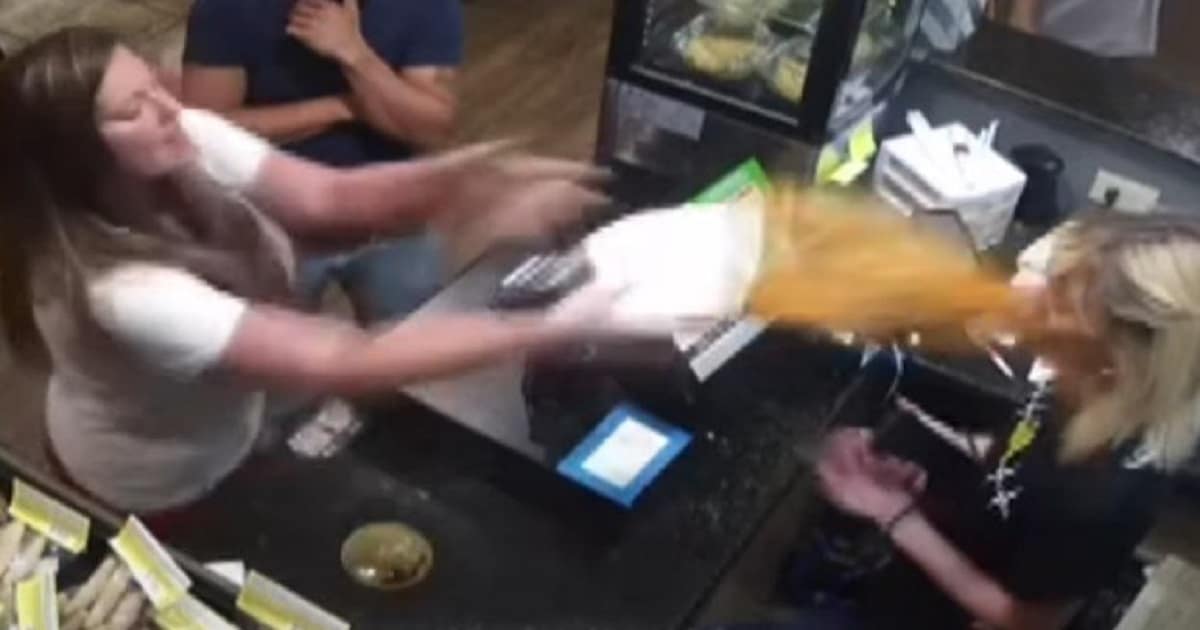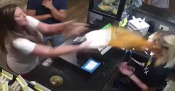 Uma cena grotesta foi registrada recentemente em um restaurante em Temple, no Texas (EUA). Uma câmera de segurança instalada no local capturou o momento em que uma cliente insatisfeita atirou sopa contra o rosto da funcionária do estabelecimento.