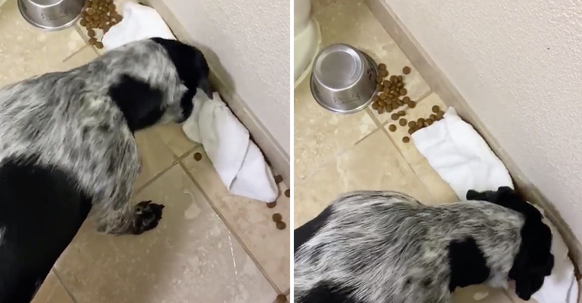 “Ele usou a toalha que eu tinha deixado e empurrou com o nariz o suficiente para ‘esconder’ a ração. Ele deixou a maior parte coberta pela toalha, mas acabou comendo os pedaços de comida que não estavam cobertos”, conta a dona de Eddie, Taylor Fox disse ao The Dodo.