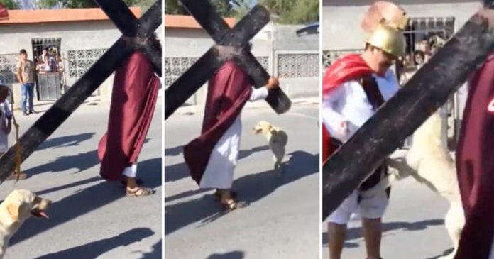 Não, Jesus ainda não retornou à Terra. O caso ocorreu em uma procissão no México, na última Sexta-Feira Santa. Na ocasião, a procissão estava sendo registrada em vídeo. E quem viu as imagens, pode notar que alguém roubou toda a cena para si. Um valente cãozinho aparece nas imagens tentando defender o ator que interpretava Jesus Cristo, já crucificado e subjugado pelos soldados.