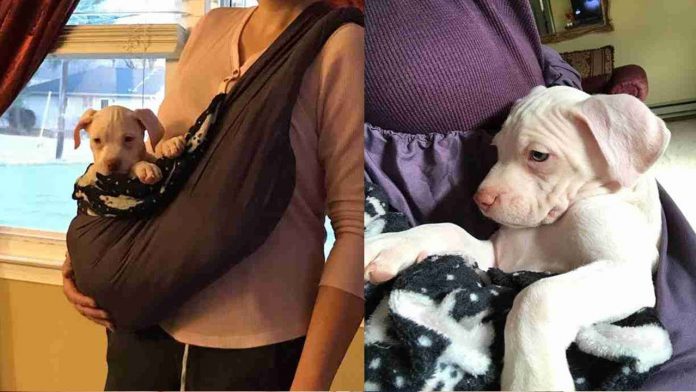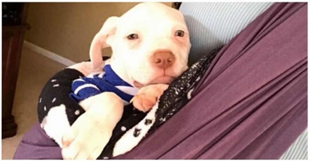 Foi aí que a tutora do cãozinho teve uma ideia. Percebendo que enquanto segurava Rhett ele se acalmava, Mariann comprou um saco de dormir para bebês. Eram para bebês humanos, mas todos os filhotes e bebês precisam da mesma coisa no final das contas: conforto e carinho.