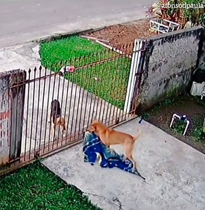 Nas imagens registradas pela câmera interna de segurança, o vira-latinha caramelo é visto no pátio de casa pegando uma colcha azul com a boca e passando-o pelas grades do portão para alcançar a um desafortunado que passava pela calçada.