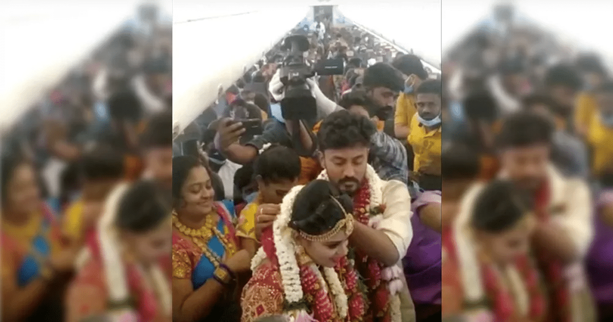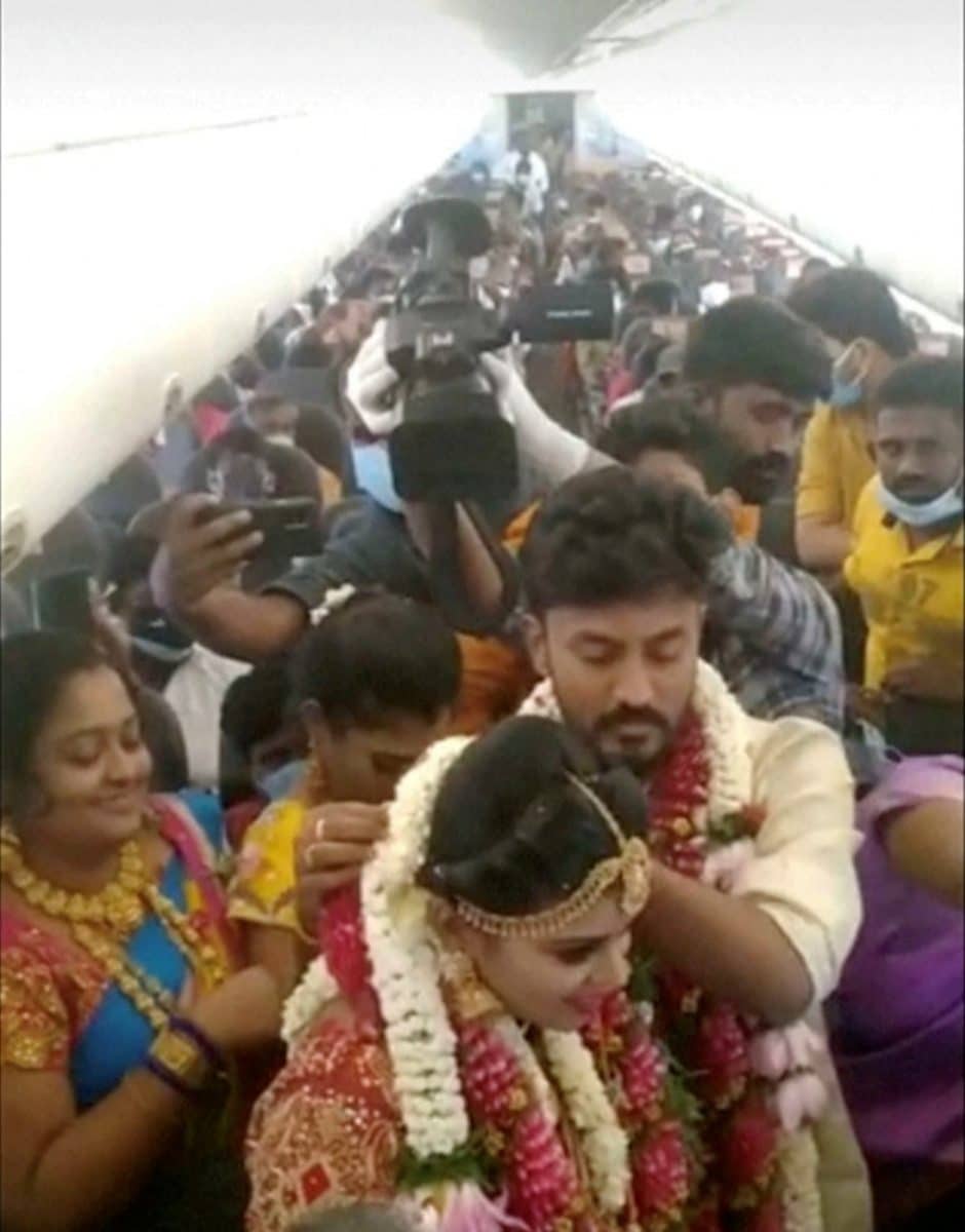 O casamento aéreo ocorreu no estado de Tamil Nadu, onde templos e salas de reuniões estão fechados e os casamentos e outros eventos sociais têm um limite de 50 convidados.